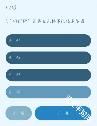 第五人格幻灯师活动中有10道题目,根据题目来选择对应正确答案即可。答案分别是50位、冷却10秒、获得8秒、速度持续20秒、破译速度降低10%等等。完整的正确答案内容见下文详情!