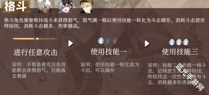 辉烬武器有刀剑、格斗、枪械、弓箭、锤斧,各个不同的武器触发的机制有所不同。刀剑需使用任意技能后再次使用任意技能,最后就可以获得最高加成了。格斗首先需要进行任意攻击、然后使用技能一,最后就可以使用技能三了。
