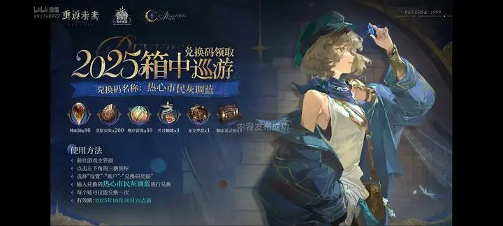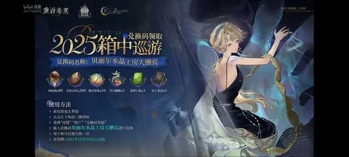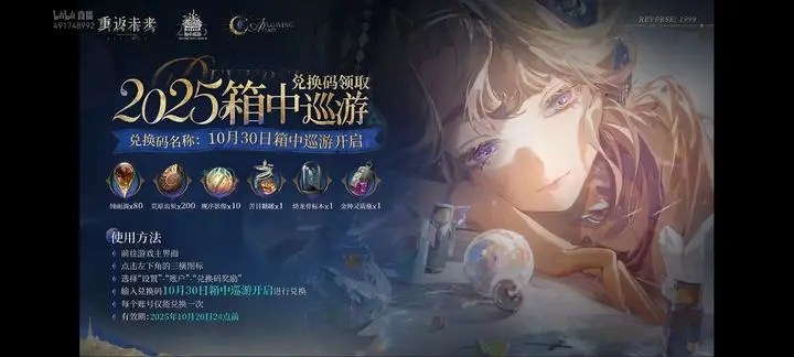 重返未来1999最新3.2版本中可用的兑换码有贝丽尔水晶工房大酬宾、热心市民灰调蓝、10月30日箱中巡游开启,兑换码在游戏中点击左下角的设置,选择账户选项中的兑换码奖励后输入即可领取。