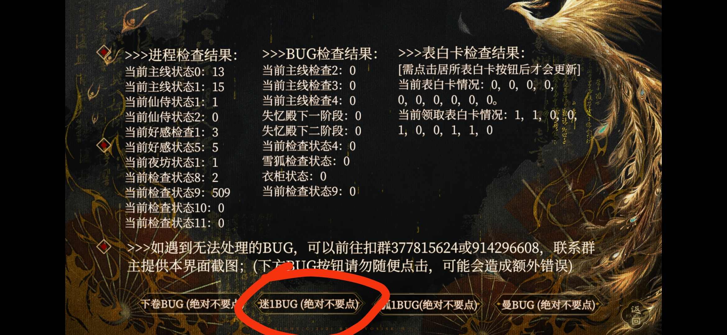 2、点击[迷1bug(前往不要点)],即可快速通过迷宫,其他的都不要按,很容易出bug,这是没有办法的办法,不到万不得已的时候千万千万不要使用!