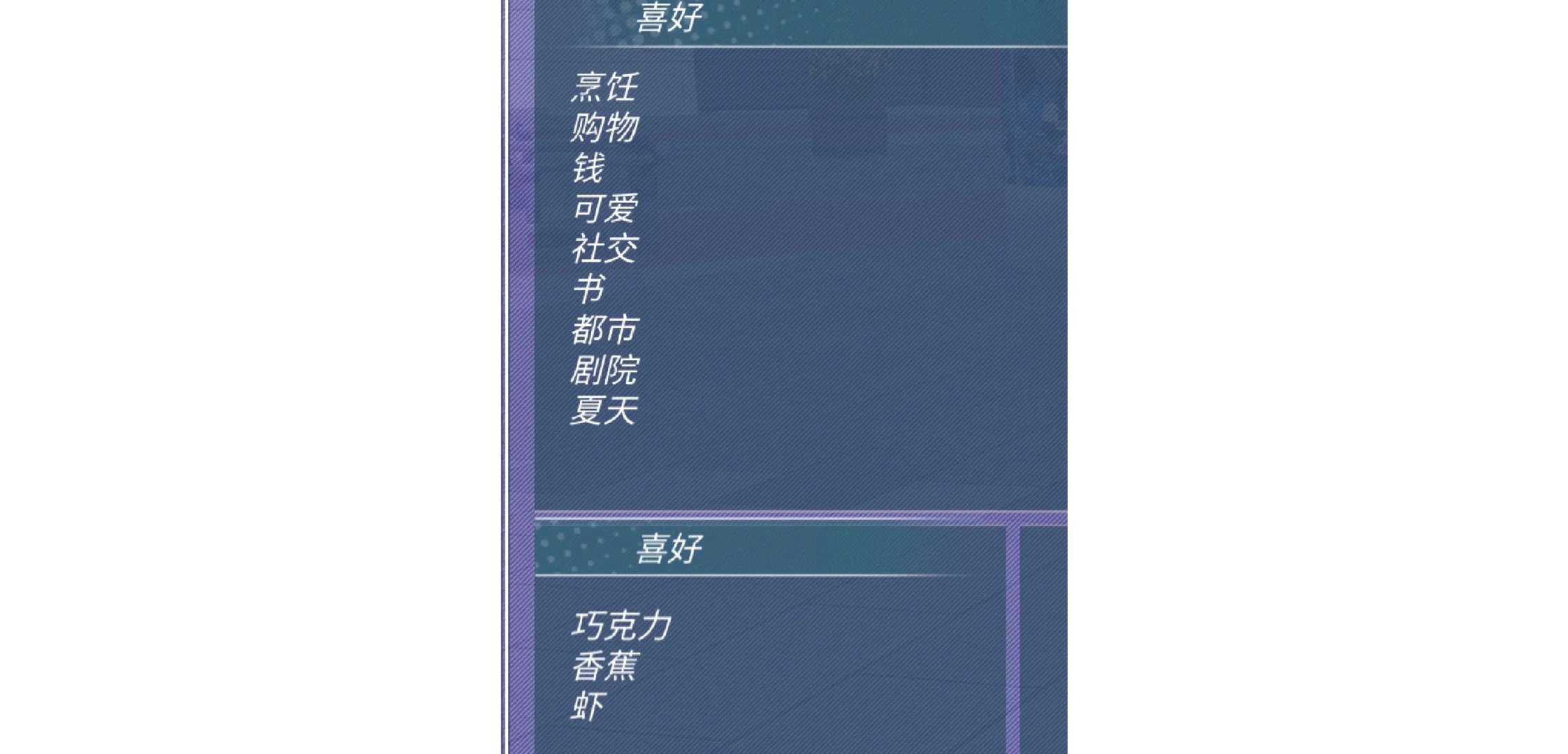 不喜欢运动。喜欢社交,信任大多数人。喜欢购物,大牌衣服,送别人昂贵的礼物和收到别人送的昂贵礼物,喜欢别人给钱让她花。喜欢待在城市里,不喜欢自然,动物。喜欢做饭,送给她煎锅,帮她打下手。喜欢夏天,讨厌冬天。喜欢别人夸她可爱,天真纯洁,穿可爱的衣服