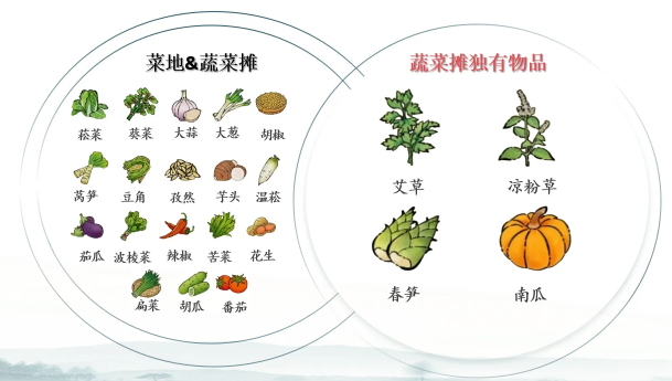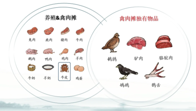 盛唐宫宴西市地摊有蔬菜摊、水果摊、杂货推、禽肉摊、海鲜摊、五谷摊。蔬菜摊推荐凉粉草/春笋/艾草/南瓜;水果摊推荐青梅/柿子;杂货摊推荐牡丹/蜂蜜/蓬草/莲子/龙眼/菊花/黍米/姜;禽肉摊推荐鹊舌/鹌鹑/鸲鹆/骆驼肉/驴肉;海鲜摊推荐鳗鲡鱼/莲藕/鲨鱼。