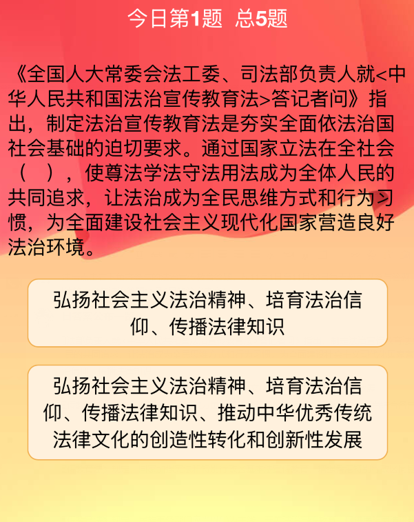 1、《全国人大常委会法工委、司法部负责人就<中华人民共和国法治宣传教育法>答记者问》指出,制定法治宣传教育法是夯实全面依法治国社会基础的迫切要求。通过国家立法在全社会( ),使尊法学法守法用法成为全体人 民的共同追求,让法治成为全民思维方式和行为习惯,为全面建设社会主义现代化国家营造良好法治环境。