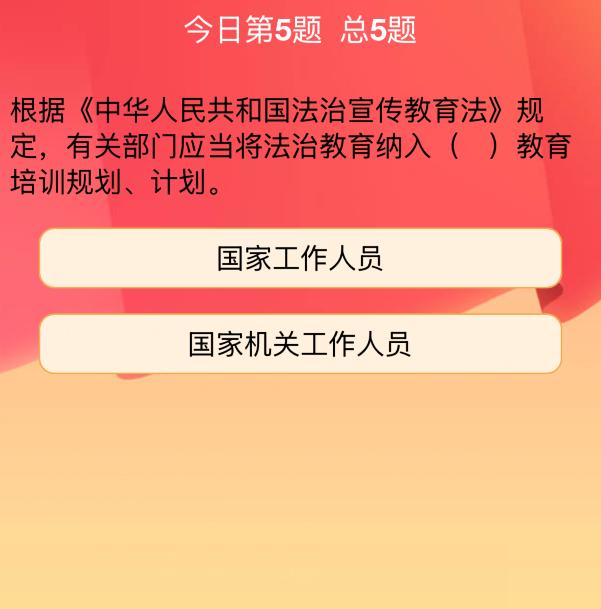 5、根据《中华人民共和国法治宣传教育法》规定,有关部]应当将法治教育纳入()教育培训规划、计划。