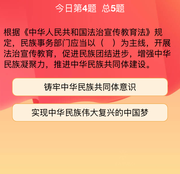 4、根据《中华人民共和国法治宣传教育法》规定,民族事务部门应当以( )为主线,开展法治宣传教育,促进民族团结进步,增强中华民族凝聚力,推进中华民族共同体建设。