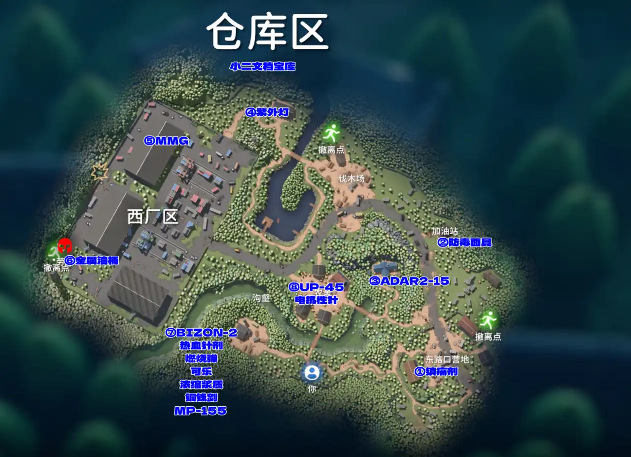 逃离鸭科夫仓库区中的蓝图以及配方有镇痛剂、防毒面具、ADAR2-15、紫外灯、MMG、金属油桶、BIZON-2、 热血针剂、 燃烧弹、可乐、浓缩浆质、铜钱剂、MP-155、UP-45、电抗性针等。在大地图中指定的位置区域即可找到这些物品,大部分蓝图都集中在地窖岔路口的地摊人,有天克幽灵的铜钱剑,有制作毒液需要用的浓缩浆质,还有补水超给力的可乐。