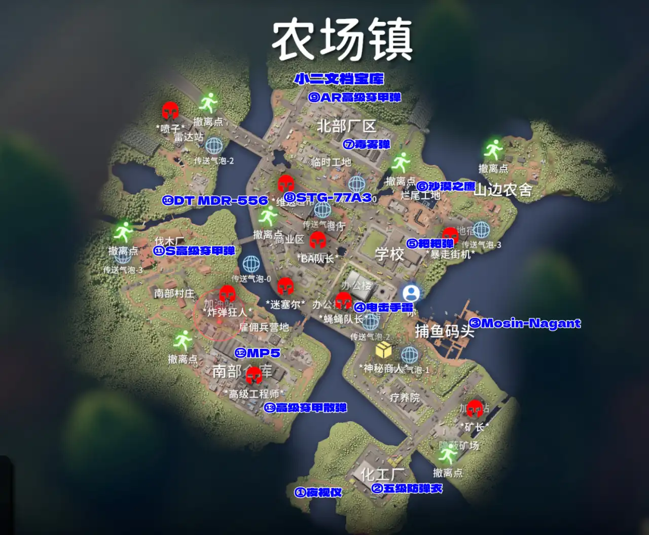 逃离鸭科夫农场镇中的蓝图以及配方有夜视仪、五级防弹衣、Mosin-Nagant、电击手雷、粑粑弹、沙漠之鹰、毒雾弹、STG-77A3、AR高级穿甲弹、DT MDR-556、S高级穿甲弹、MP5、高级穿甲散弹。在大地图中指定的位置区域即可找到这些物品,下文列举具体的分布位置区域点!