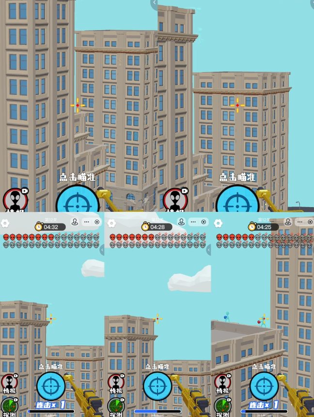 简介:狙击外星人是一款休闲射击游戏,以寻找并狙击伪装的外星人为核心玩法,玩家需要在充满普通市民的城市场景中,仔细甄别出行为怪异或外形有破绽的外星人,瞄准然后迅速开枪一击必中。游戏内的每一关外星人的隐藏位置和行为模式都会变化,游戏氛围轻松,节奏明快,滑动屏幕可以移动视角、缩放瞄准、点击射击,上手很快。游戏提供大量的关卡,每个关卡有不同的任务要求,新鲜感十足,能在碎片时间享受一发入魂的爽快感。