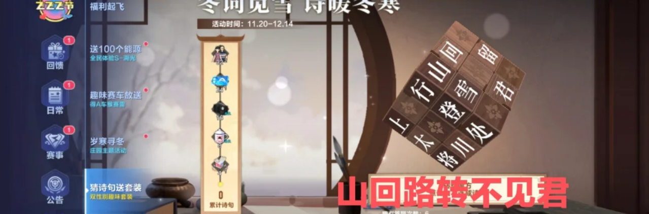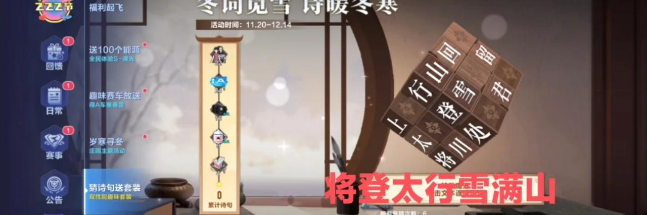 QQ飞车手游最新更新冬词觅雪诗暖冬寒活动,需要根据当前题目中给的填词来猜诗词回答正确答案。第六天答案分别是欲渡黄河冰塞川,将登太行雪满山、山回路转不见君,雪上空留马行处。